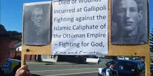A reader has sent in two videos he took on Anzac Day of a man being threatened with arrest for his sign, with the police taking his details. The sign had a simple Christian message on one side and a tribute to his uncle on the other.