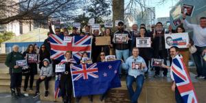 This morning at 12 noon in Aotea Square, Auckland, a group of around 60 free speech activists gathered to protest the imprisonment of Tommy Robinson by the UK government for reporting on the Muslim rape gang court cases.